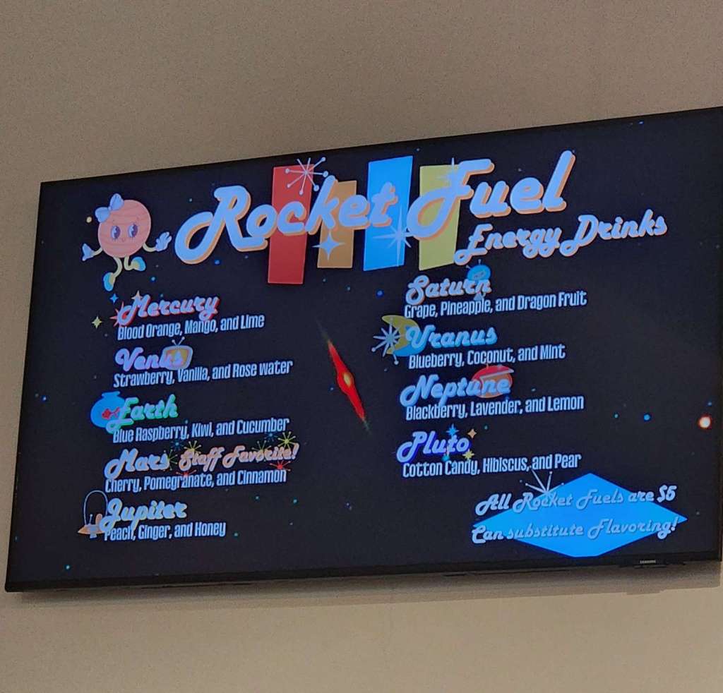 It was a huge place, and in the back they actually had a coffee bar. I knew the last thing I needed was more caffeine but I wanted to at least check out the seating. I had to smile when I saw they branded their energy drink mixes as “rocket fuel.” (a callback to my last post, if you missed it). “These are your people, nerd”, I heard the universe say. “Why try to fight it.”
