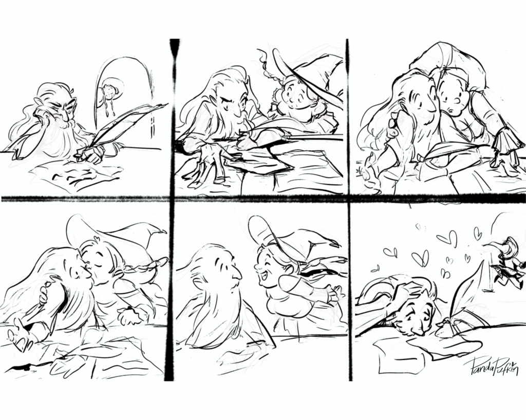 This is all well and good, until I started realizing all the vis-dev that would need to go into fleshing out the characters and the world. It was completely overwhelming. I’d been procrastinating on it for days. After my trip to the comic shop, I decided to just rough out one of the scenes in my head, to get some momentum. Did I have their designs down? No. Do I know where this scene is set? Who that villain is? No and no. But the soul of the characters are here.