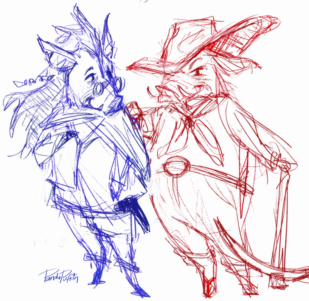 I picked a Javalina for my couple. I saw one for the first time in the wild when I was in Sedona a few weeks ago, just running across the street in the middle of a neighbourhood at 5 in the morning. “Pig” is an epithet that has been thrown at me before, and it feels sort of nice to reclaim that – javelinas have a bit more swagger, and will absolutely cut a bitch if you get in their space. I need my protags to be rough, and old and wrinkly, and chubby, and feisty as fuck. I want to subvert conventional attractiveness in every way, so people like me can see themselves in something other than a side comic relief character.