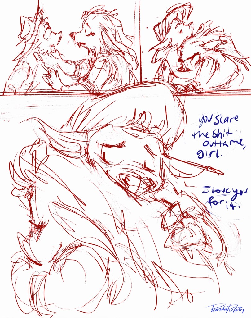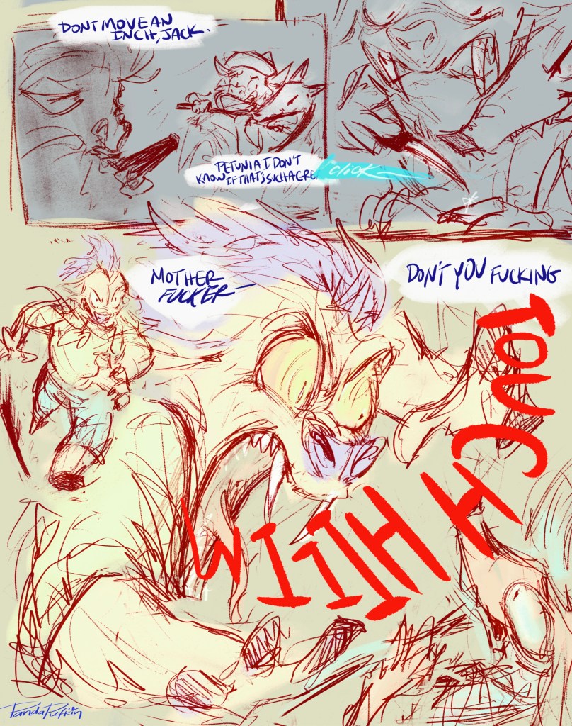 If I ever get this comic off the ground and it gets popular, I want to see the freaks on furaffinity go wild with these two – that’s how I’ll know I’ve made it. If I can get furries making rule 34 art of chubby senior citizen javalina cowboys, we’re cooking with gas. Even if I’m not a furry, those – the universe would again say to me – are your people, nerd.