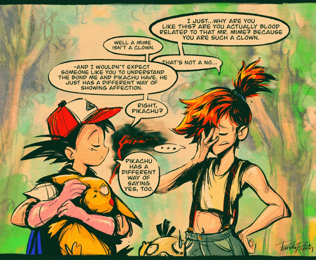 Really, if I had the star trek holo deck and could just BE Misty, that would probably be ideal. She has that perfect fiesty tomboy personality, and my favorite pokemon – psyduck. Just exploring the world with my cute pets, a boy who I am constantly exasperated by and drives me crazy, but very maybe secretly I have a little crush on (which I am also annoyed by), and a chill, knowledgeable dad type (we can just omit the sex pest part). Add in the bonus of being “harrassed” by the cuntiest trio – a true diva, her flamboyant gay man best friend, and a world weary, chronically anxious talking cat from brooklyn. Sounds like a riot, if I’m being quite honest.