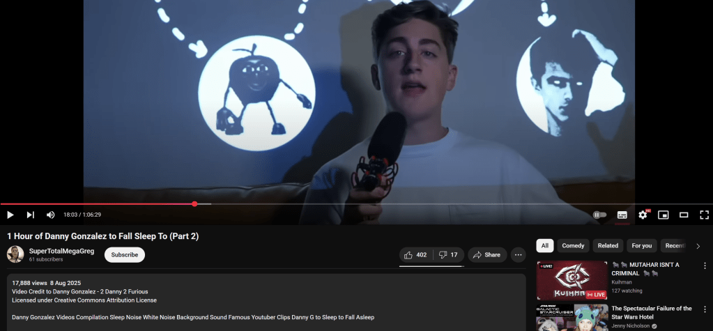 Ok. I am aware it is very cringe to get mad on behalf of a creator, particularly a multimillionaire. I’m not even really mad, I’m just in disbelief. I’ve been seeing more and more of these “1 hour of danny gonzalez” videos which are just straight rips – It must be to avoid ads or something, because why would you not just make a playlist? ONE OF THE ONLY ISSUES Danny has expressed a strong opinion about over the years is stealing/copying content, and yet people with stan account names/PFPs are making these videos. Also, no one in the comments seems to care at all? Like…you could not distill a more pure form of stealing than straight ripping the videos and uploading them on the same platform, LITERALLY AS A MARKET SUBSITUTE TO NOT HAVE TO WATCH THE ADS. And I know, I know I know I knooowww Danny has plenty of money, his videos still get millions of views, he’ll be fine, who cares. That’s where I was with it, but the reason I am making this post is because I had clicked on one of these videos and was looking at which videos they picked, and…