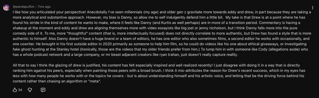 I’m mentally preparing for danny to have a different kind of exposure, and emotionally preparing for people to critique him with greater or lesser degrees of intelligence and good faith. I like to think I’m enlightened enough to not feel defensive on behalf of an entertainer I watch. That would be peak cringe behavior, especially for a 33 year old. Me, cringe? Couldn’t be. But to be fair, the defensiveness part has rarely been tested. Danny just doesn’t have many vocal haters. There was one video I saw recently about Drew that was praising him for all the ways he was different and “better” than his peers (including danny) and…..I caved, I did leave a comment. I was nice, at least that was the intention, and I acknowledge I also had a subjective bias, but it was absolutely wall-of-text cringe. It’s not something I need or want to be doing, it’s never going to move the needle or be constructive.