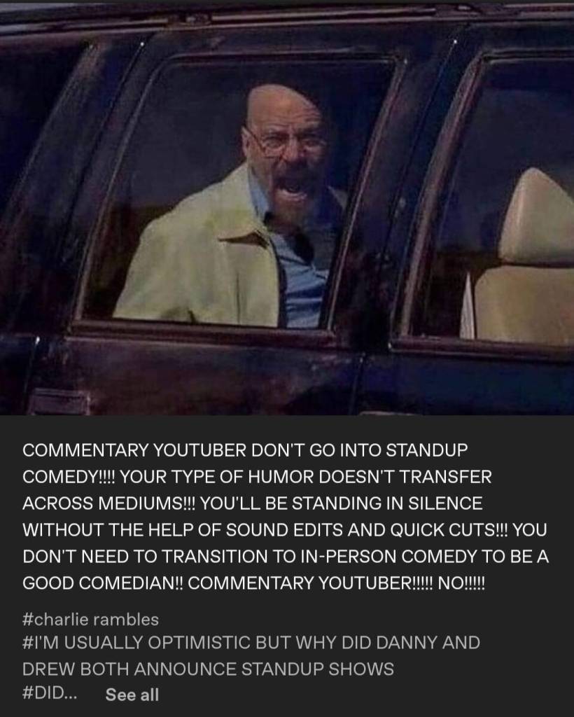 Angel: Even if the sentiment that commentary youtubers shouldn’t ever try standup is questionable, maybe danny would see it as a blessing that people are coming in with some level of skepticism. He is more likely to get honest feedback that will help him improve, and that could lead to greater success outside his existing fan base. Even if it’s a pretty silly thing to say, and was also clearly a talking point ripped from a video about kurtis without real understanding, people put out silly opinions on social media all the time. It really could not matter les—-