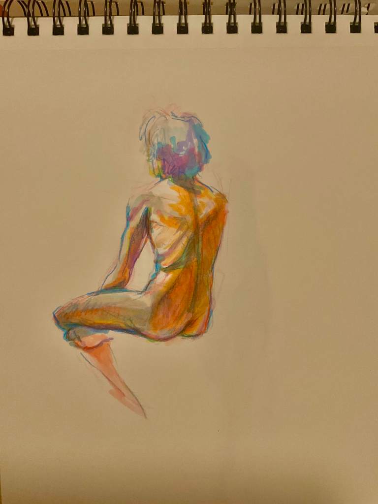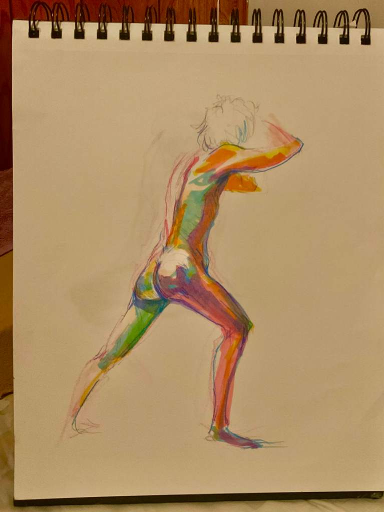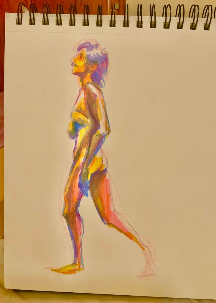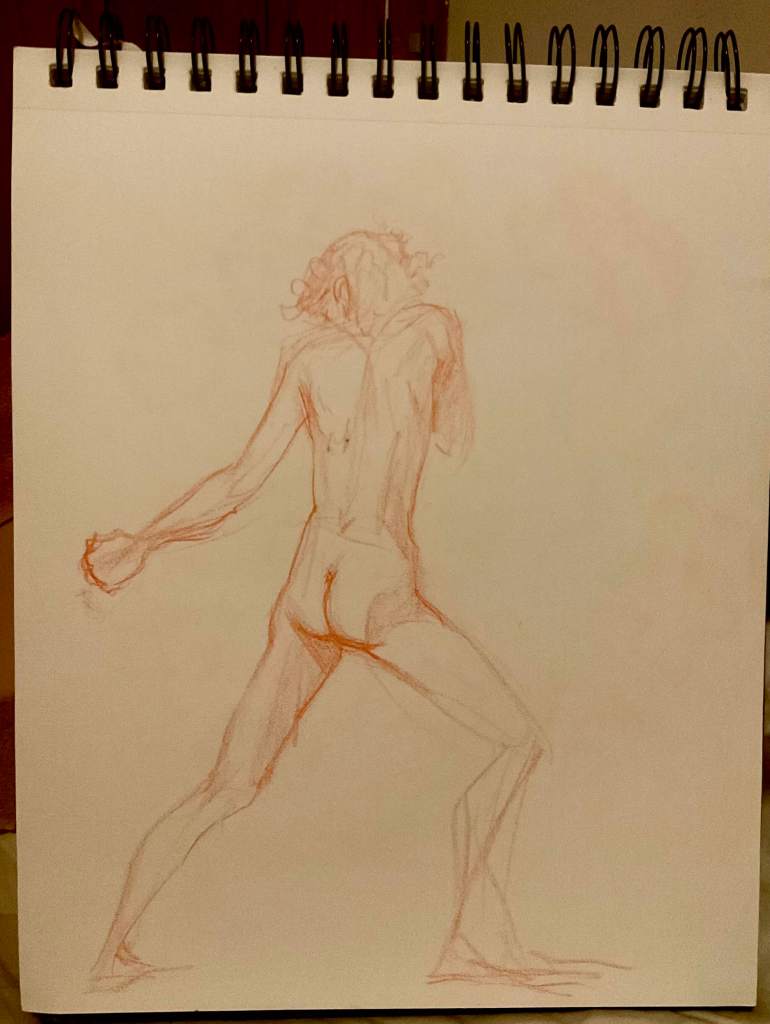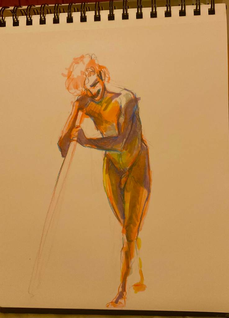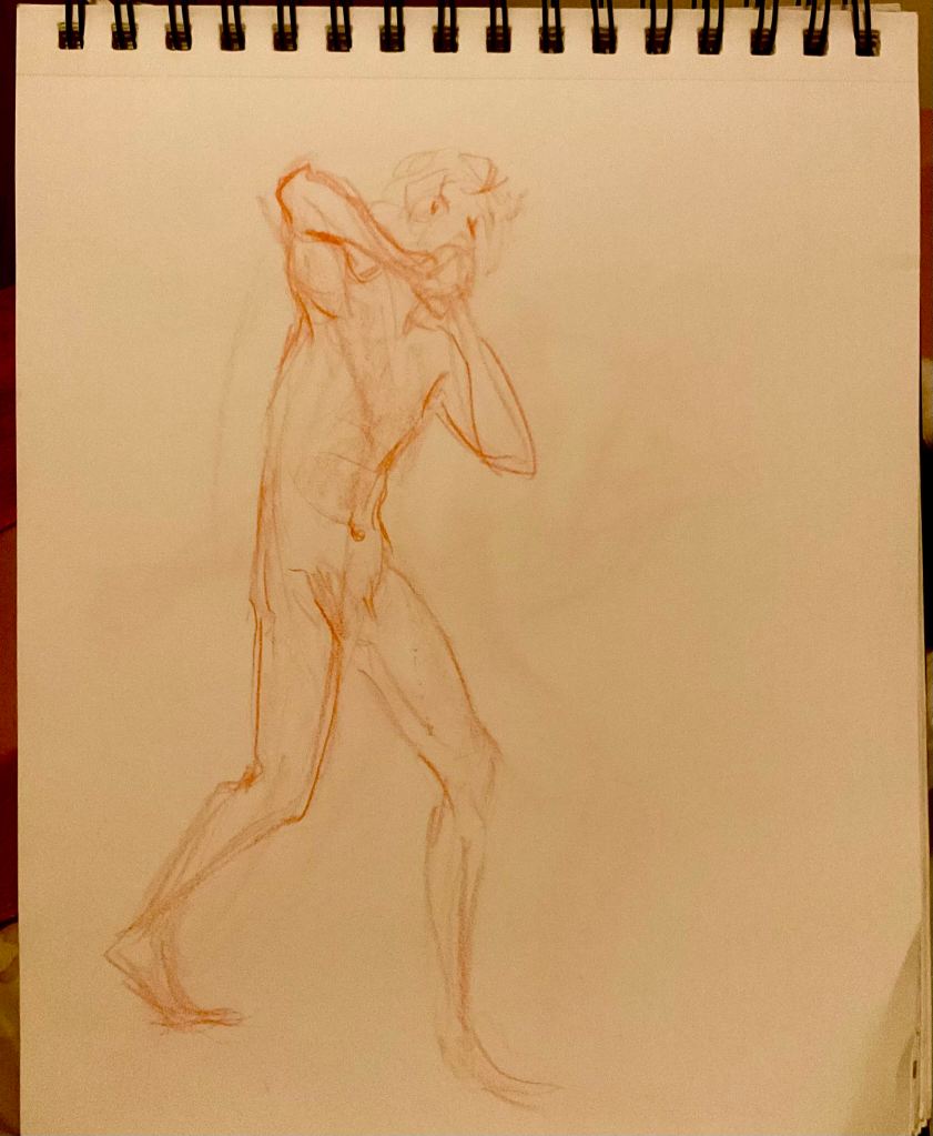 Below is a little rant I went on after figure drawing, which I realized listening back was also heavily influenced by the experience at the book store. And also, the sketches I drew. I can remember since middle school, the goal was to get away from “cartoony”. Even up through those illustrator professional development classes I took, something looking “cartoony” was a critique to fix. Realism meant less amateur, more skilled. I have found since I let my characters look cartoony, while still using the anatomy in front of me as my primary reference, my pictures just look more alive. To me any way. They also look more Robyn, whatever that means. Maybe it’s a case of knowing what advice is for you, what context was it given in. Sometimes we hold ourselves to such ancient rules, buried so deep we don’t realize they are something we can question.